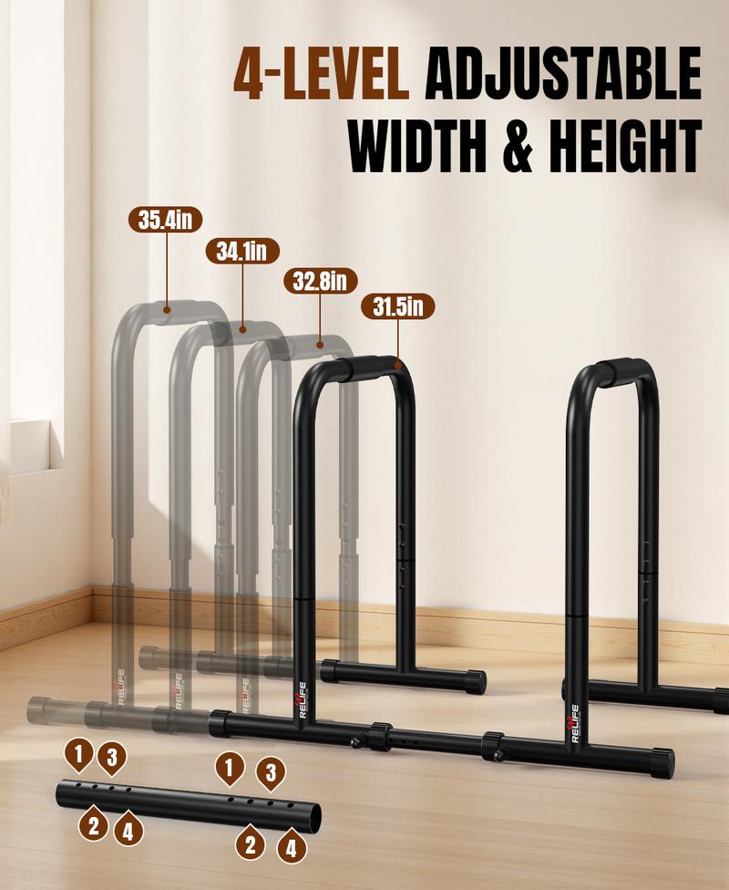 - Adjustable height from 30.7"–35" to fit your needs. Ideal for dips, pull-ups, push-ups, leg raises, bench press, and more—working arms, chest, triceps, core, and back. Enjoy a full-body workout at home without the gym.